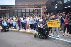 Paul has visited the school during previous Ride For Life events and is extremely grateful for the continued support. Joining him was Jordan, of Islandia, who came to Ames for the first time. Jordan said that ALS is not a common ailment and Massapequa’s ninth graders can now serve as ambassadors to raise awareness. Students lining the front of the school held signs with messages like “Never give up,” “Stay strong” and “Ames is fighting for you.” Members of the student council carried banners with the pictures and names of people who have lost their battle with ALS.