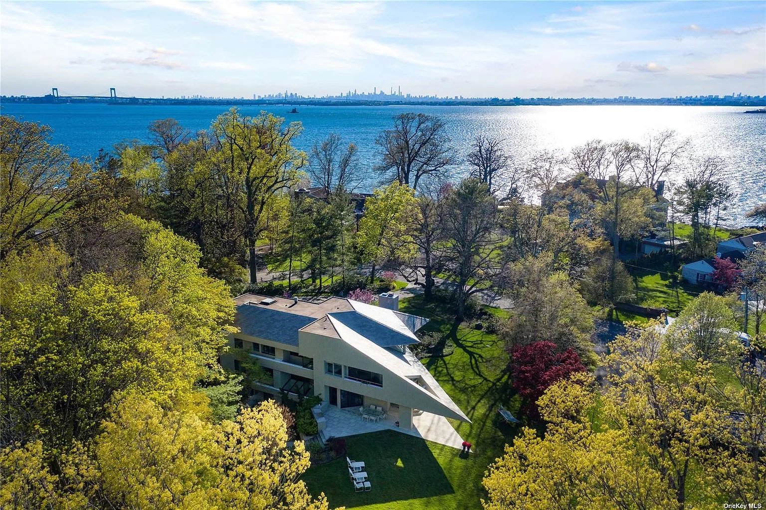 Nestled at the end of a quiet cul-de-sac in Kings Point, 49 Pond Road is a stunning modern, contemporary residence custom-built to emphasize exquisite views of the Long Island Sound and Manhattan Skyline. This home sold on Aug. 21 for $5,300,000. It has six bedrooms and five bathrooms. The exterior was designed using timeless materials featuring a cascading blue-slate roof while effortlessly integrating limestone and wood elements. The property boasts more than 1.3 acres; the majestic grounds have matured, colorful privacy plantings and sprawling flat lawn space. The yard includes a large stone entertaining patio that is half-covered and has a built-in outdoor kitchen and a roomy storage shed. The residence comes with access to a private, sandy beach.