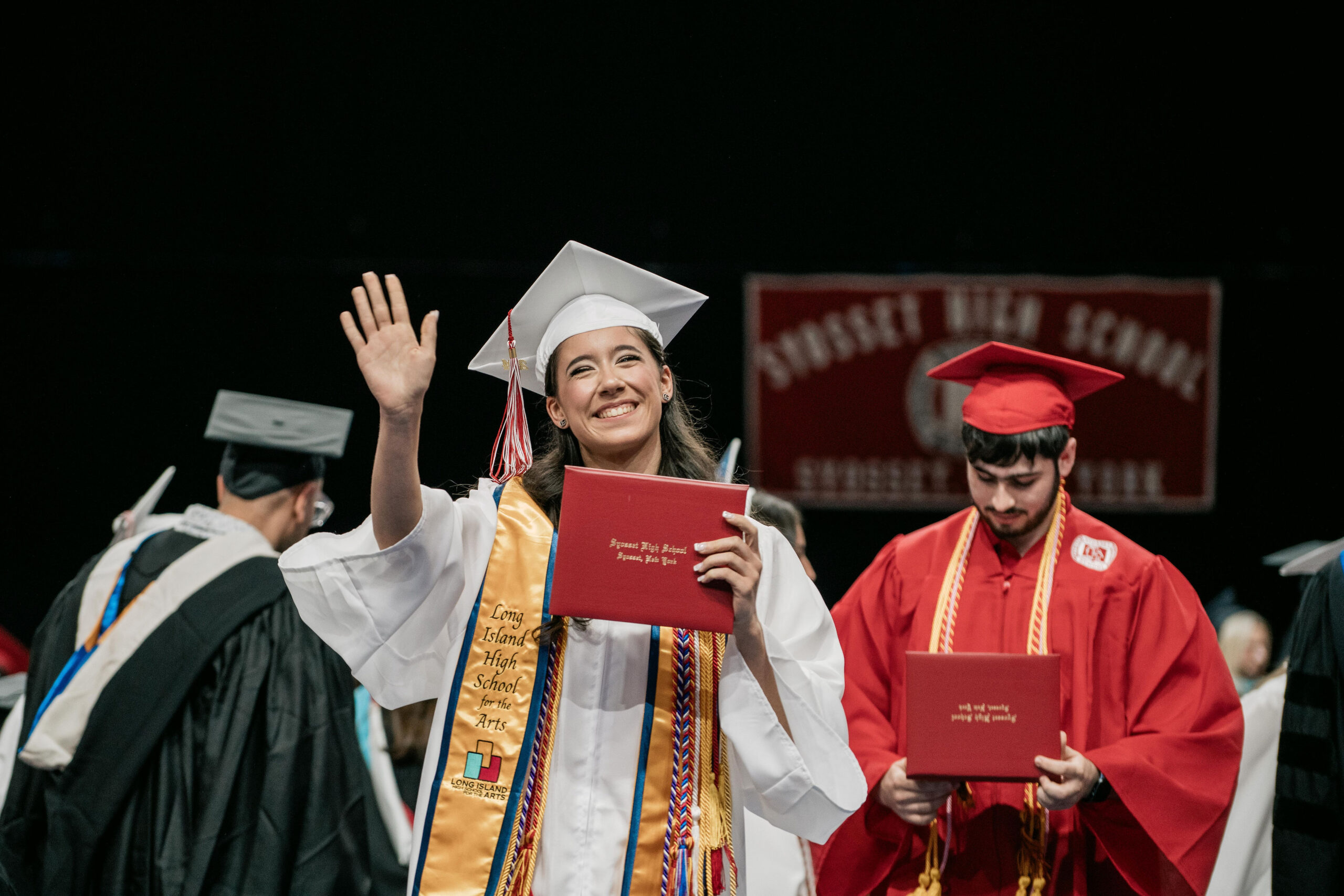 “We began high school behind computer screens after having a pretty sad drive-by middle school graduation,” said Class Speaker Sally Jamison. “Now we’re all sitting in rows at Hofstra, unmasked and ready to have our first real graduation.”