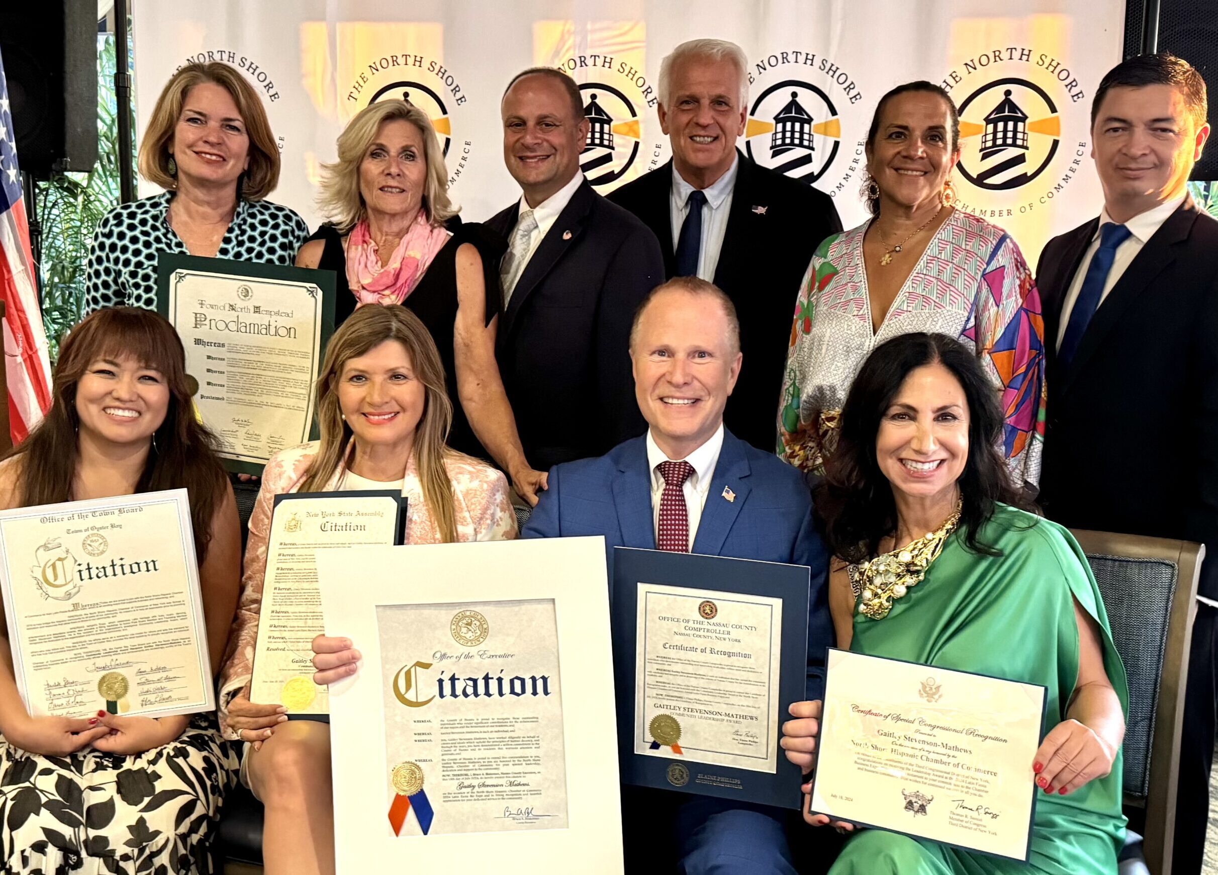 Seated, from left to right: NSHCC Secretary Denky Begonja, NSHCC President Connie Pinilla, Esq., Leadership Award Recipient Gaitley Stevenson-Mathews, and NSHCC Sponsorship Officer Nadia Vee. Standing, from left to right: North Hempstead Supervisor Jennifer DeSena, Glen Cove Mayor Pam Panzenbeck, Glen Cove Councilman Michael Ktistakis, Glen Cove Councilman Grady Farnan, NSHCC Legal Counsel Lisa Golden, Esq., and NSHCC Vice President Ever Padilla.