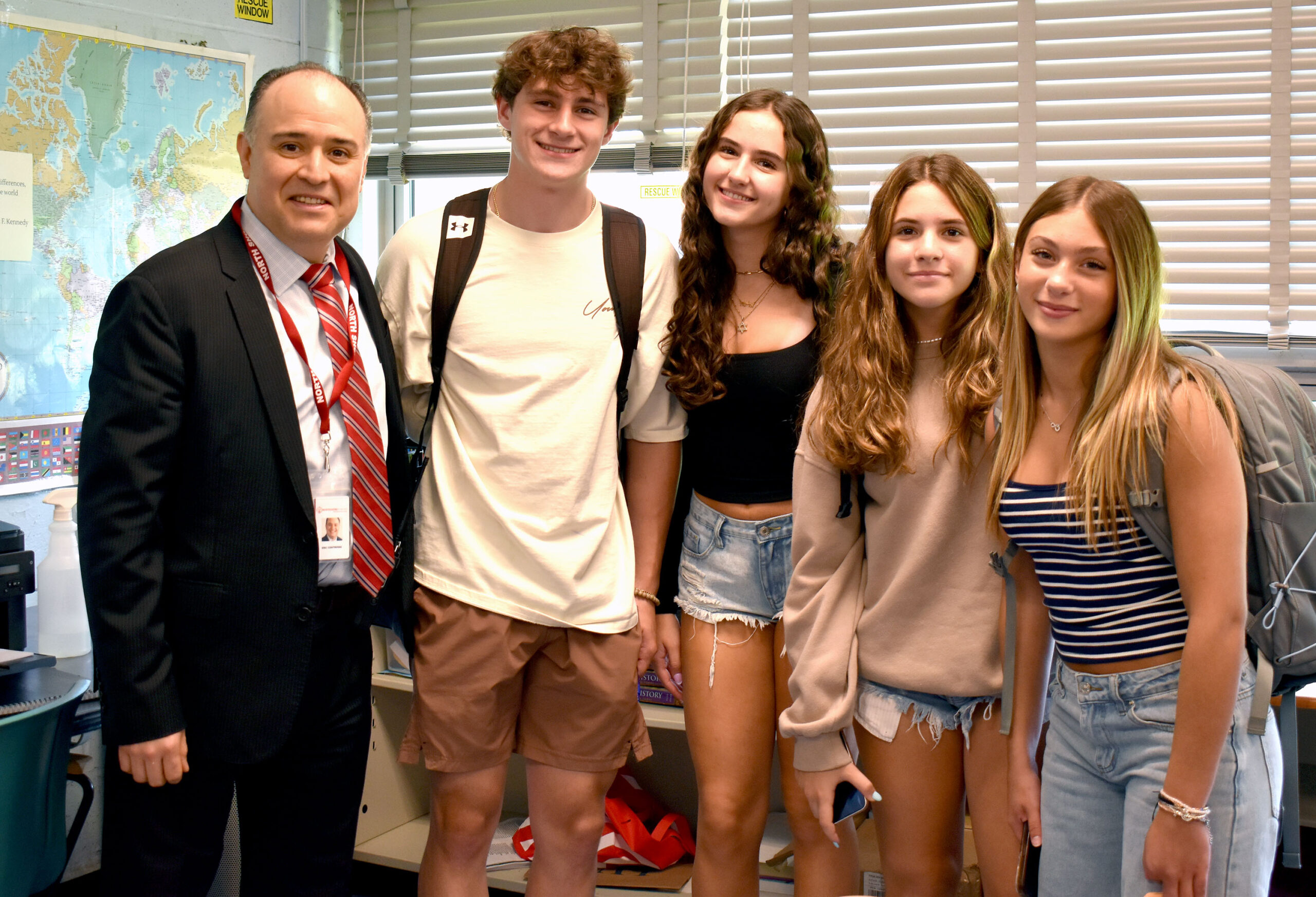 North Shore high schoolers smile for their first day back with principal Contreras (Photos provided by North Shore Central School District)