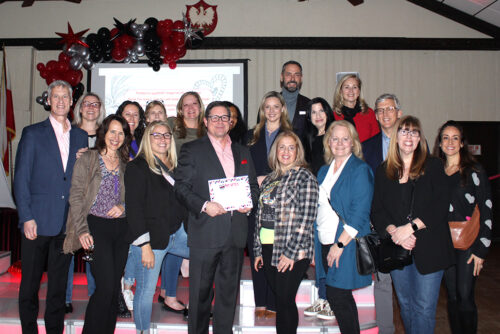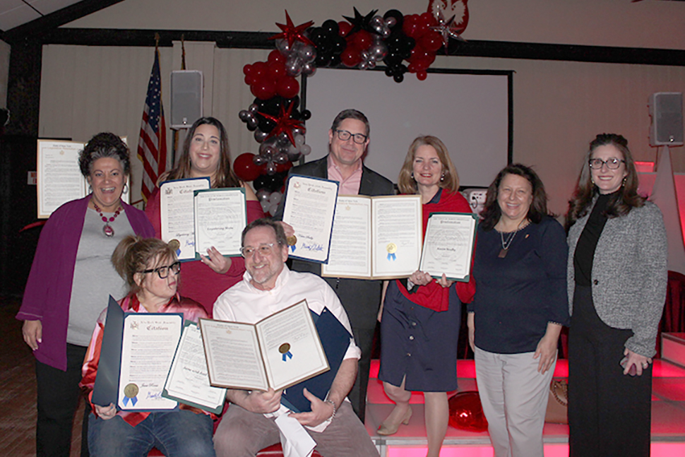 Honorees with local elected officials and representatives. Bottom row, from the left: Jane Ronis and Joel Ronis, HEARTS Red Party Honorees. Top row, from the left: NY State Assemblyperson Gina Sillitti, Leyalanny Mata (Founder’s Award Recipient), Kevin Scully (Arts Education Leadership Award Recipient), Town of North Hempstead Supervisor Jen DeSena, Town of North Hempstead Council Member Mariann Dalimonte, Denise Paredes (representing the office of Jack Martins, NY State Senate)