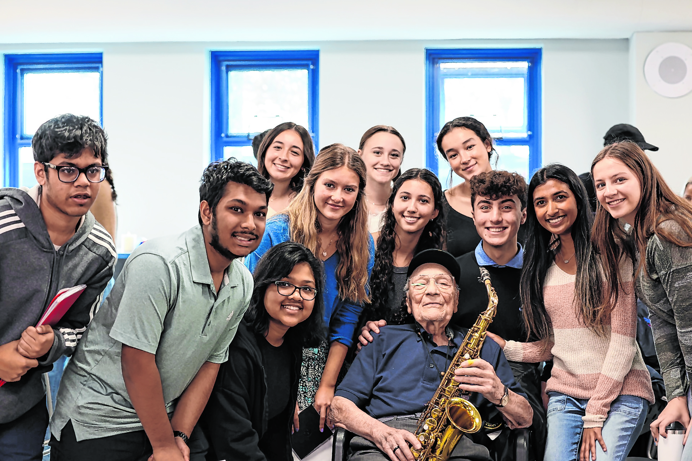 WWII veteran and musician Dominick Critelli with Herricks High School students. (Contributed photos)