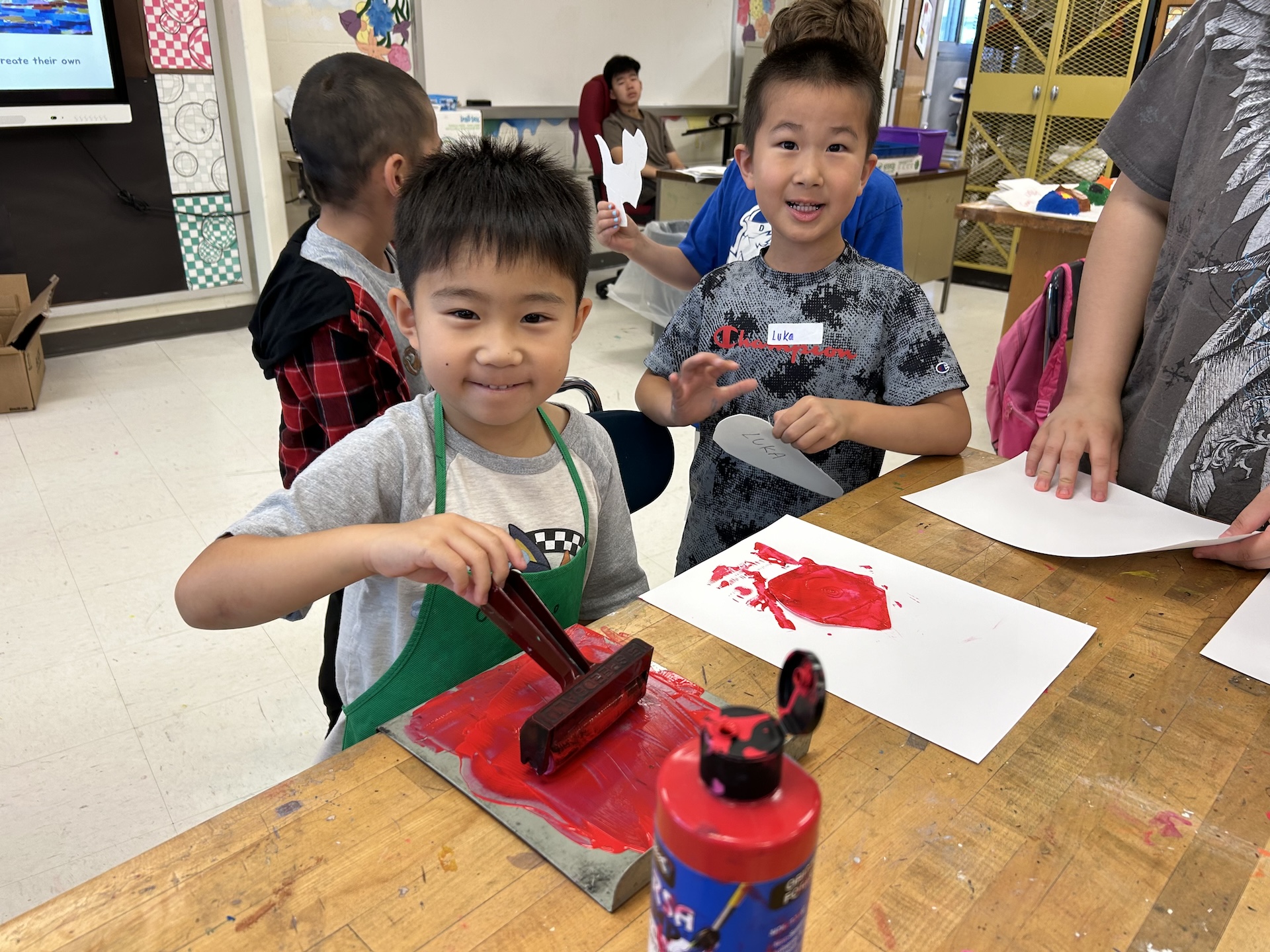 As part of the printmaking lesson, students learned about street art and created their own stamps to use on the collective brick mural. According to a slideshow from Herricks Public Schools, students loved seeing their designs on display at the end of the week on the outdoor art camp mural.