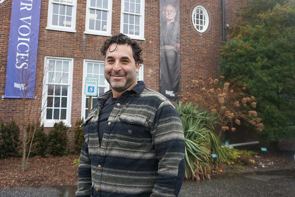 Weiss standing in front of an image of Holocaust survivor Ron Unger. (Photos by HMTC)