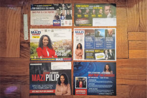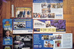 Literature for Tom Suozzi and Mazi Pilip, as well as ‘attack ad’ mailers against Suozzi, has piled up. (Credit: Janet Burns)