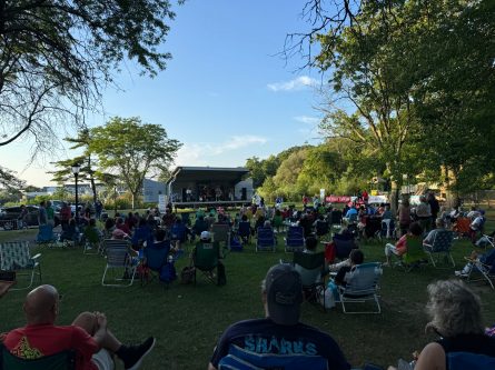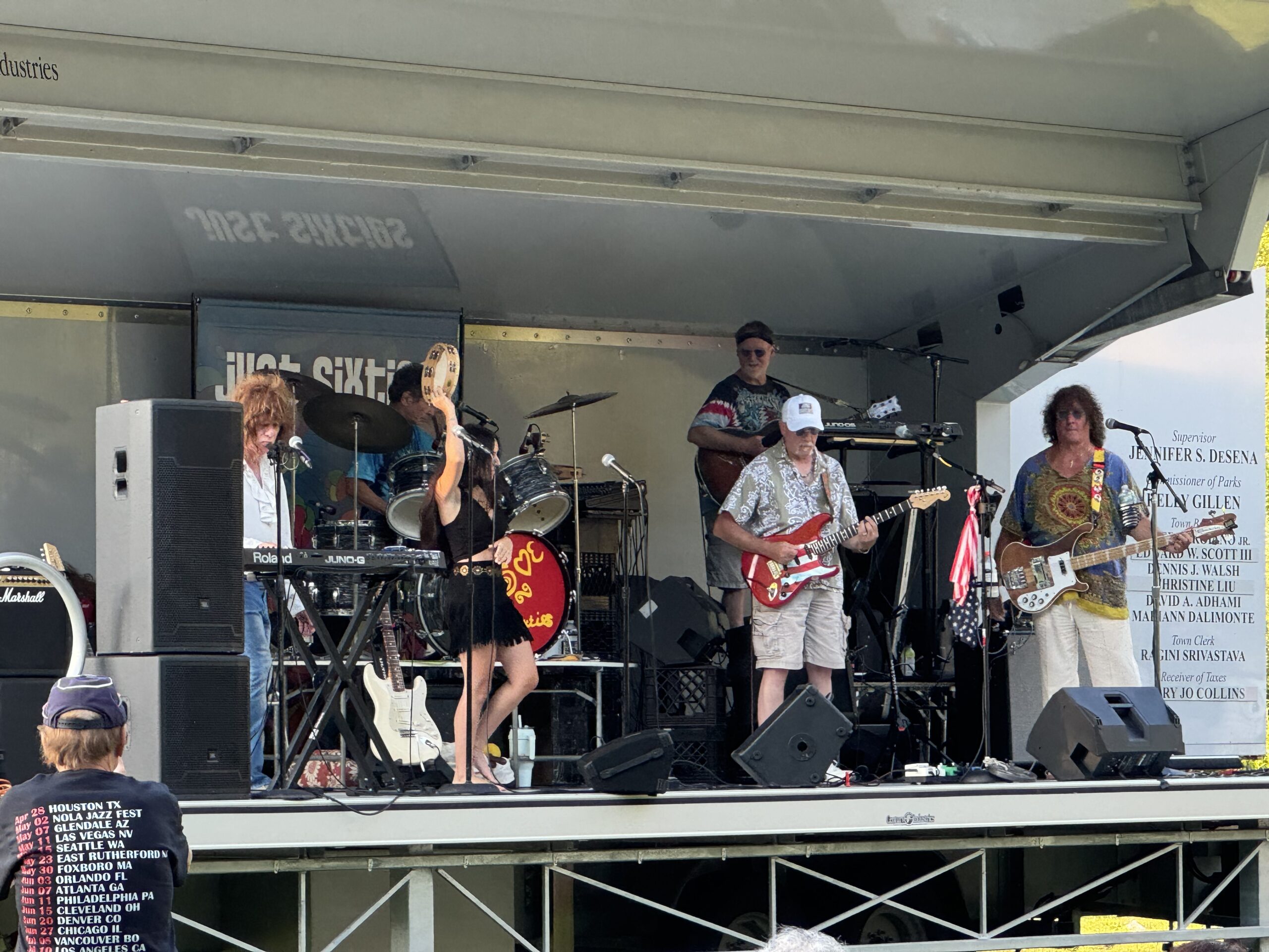 Based in Smithtown, Just Sixties consists of singer Lisa Vetrone, bassist Ed Bowe, keyboardist and guitarist Michael Gerver, keyboardist and guitarist Donny West and guitarist Phil Carollo. Concert attendees—some wearing Just Sixties merchandise t-shirts—brought lawn chairs, blankets, snacks and even pets to watch the band perform. A handful of guests turned the field in front of the stage into a dance floor, dancing and singing along to the music.