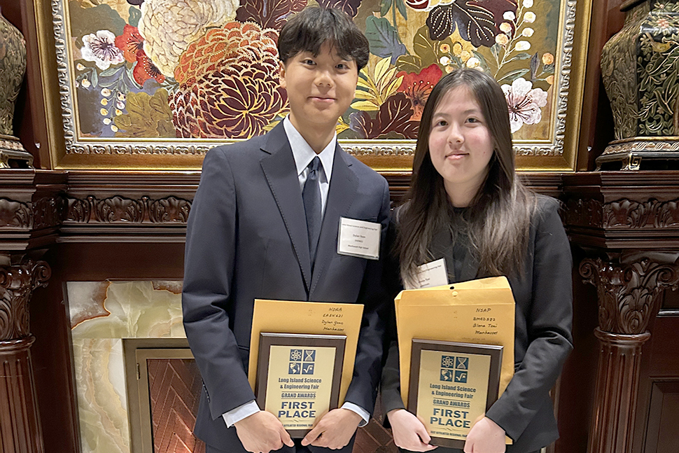 Senior Dylan Yoon and junior Alena Tsai are Long Island Science and Engineering Fair (LISEF) Finalists and will be representing Long Island at the fair. Dylan’s project “The Enhancement of a Novel 3D-Printed Electrodialysis Device through the Implementation and Optimization of Spacer Designs,” and Alena’s project “Integrated In-silico and In-vitro Experimental Strategies for the Application of Carbon Quantum Dots in Alzheimer’s Research,” were both top finishers in the local competition.