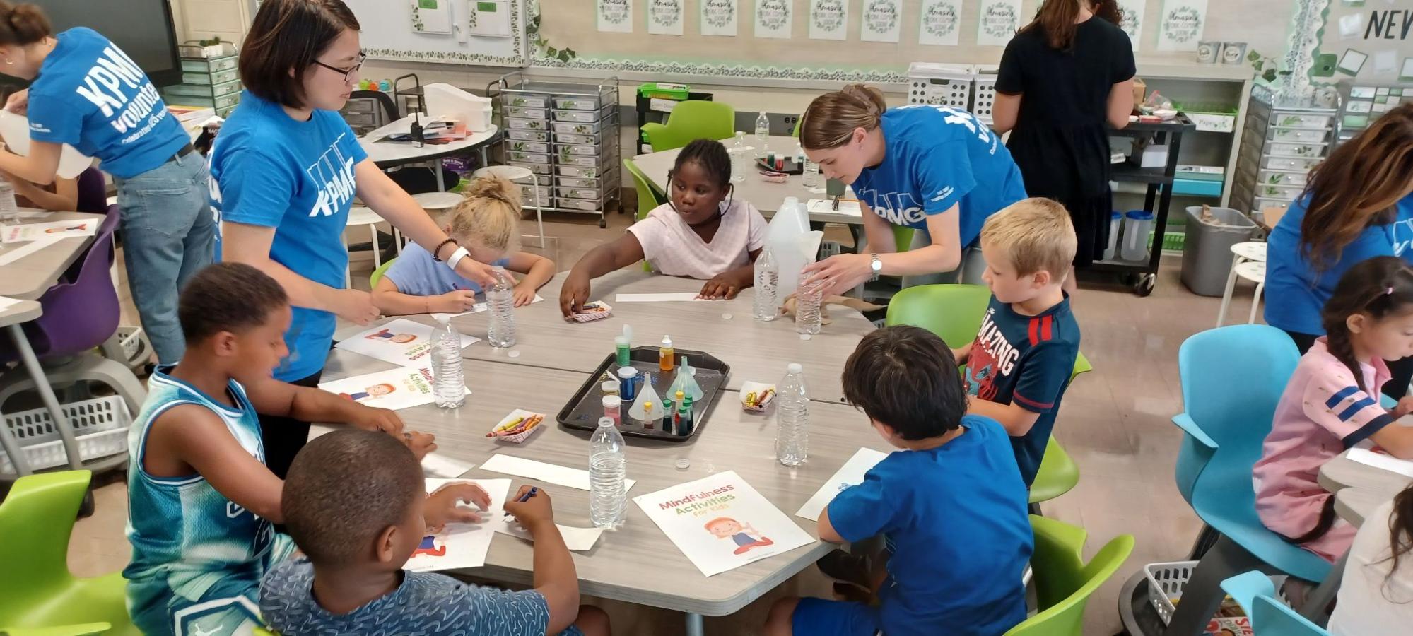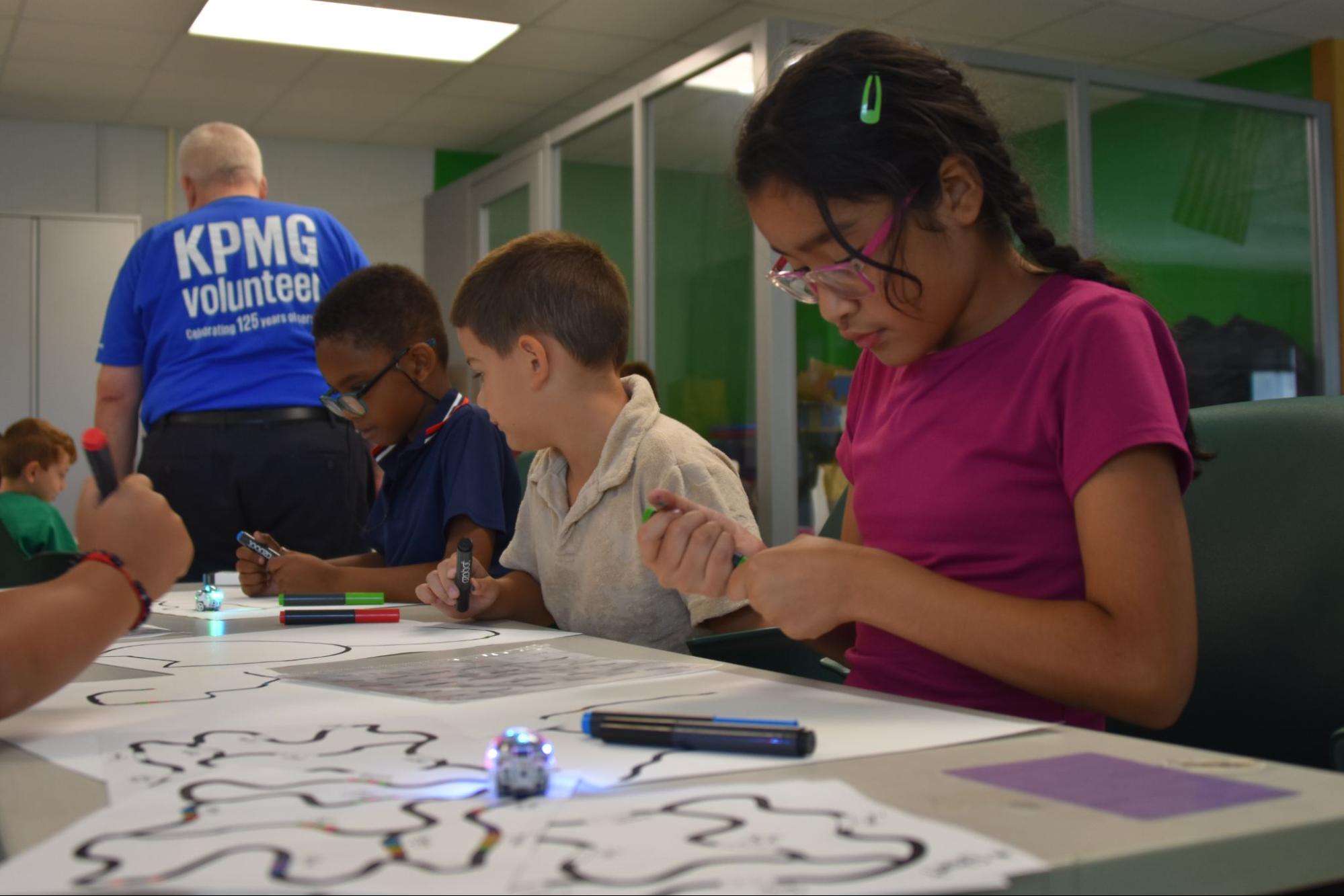 KPMG volunteers organized reading circles, ran a mental wellness-themed activity where they created calming jars, hosted a yoga session, and explored programmable robots called Ozobots in the school’s innovation lab.