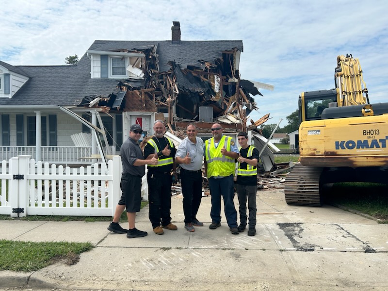 Supervisor Saladino, center, joined the Town’s Highway and Buildings crew during the demolition of this Massapequa zombie house. (Photo courtesy of the Town of Oyster Bay)