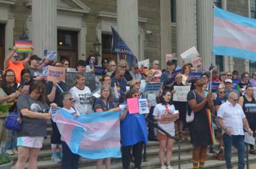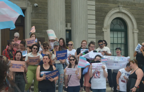 “Trans people are under attack! What do we do? Stand up, fight back,” demonstrators shouted from the building steps.