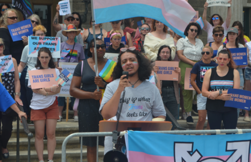 The ban was endorsed by former Olympian Caitlyn Jenner, who is transgender. Speakers at the demonstration said she cannot speak on the matter and is not a representative of transgender people.