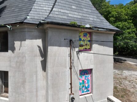 Following the installation of the Mackay Estate Gate Lodge’s custom-fabricated replica windows and doors in fall 2024, the next step in the restoration process will be to repair the historic structure’s roof. On July 3, 2024, historic architect John Collins visited the Gate Lodge site in East Hills to get a closer look at the building’s slate tile roofing using drone technology.