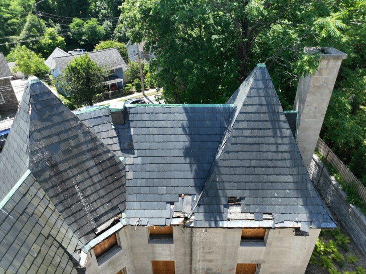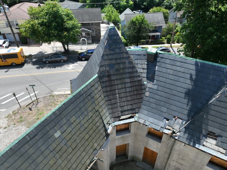 Following the installation of the Mackay Estate Gate Lodge’s custom-fabricated replica windows and doors in fall 2024, the next step in the restoration process will be to repair the historic structure’s roof. On July 3, 2024, historic architect John Collins visited the Gate Lodge site in East Hills to get a closer look at the building’s slate tile roofing using drone technology.