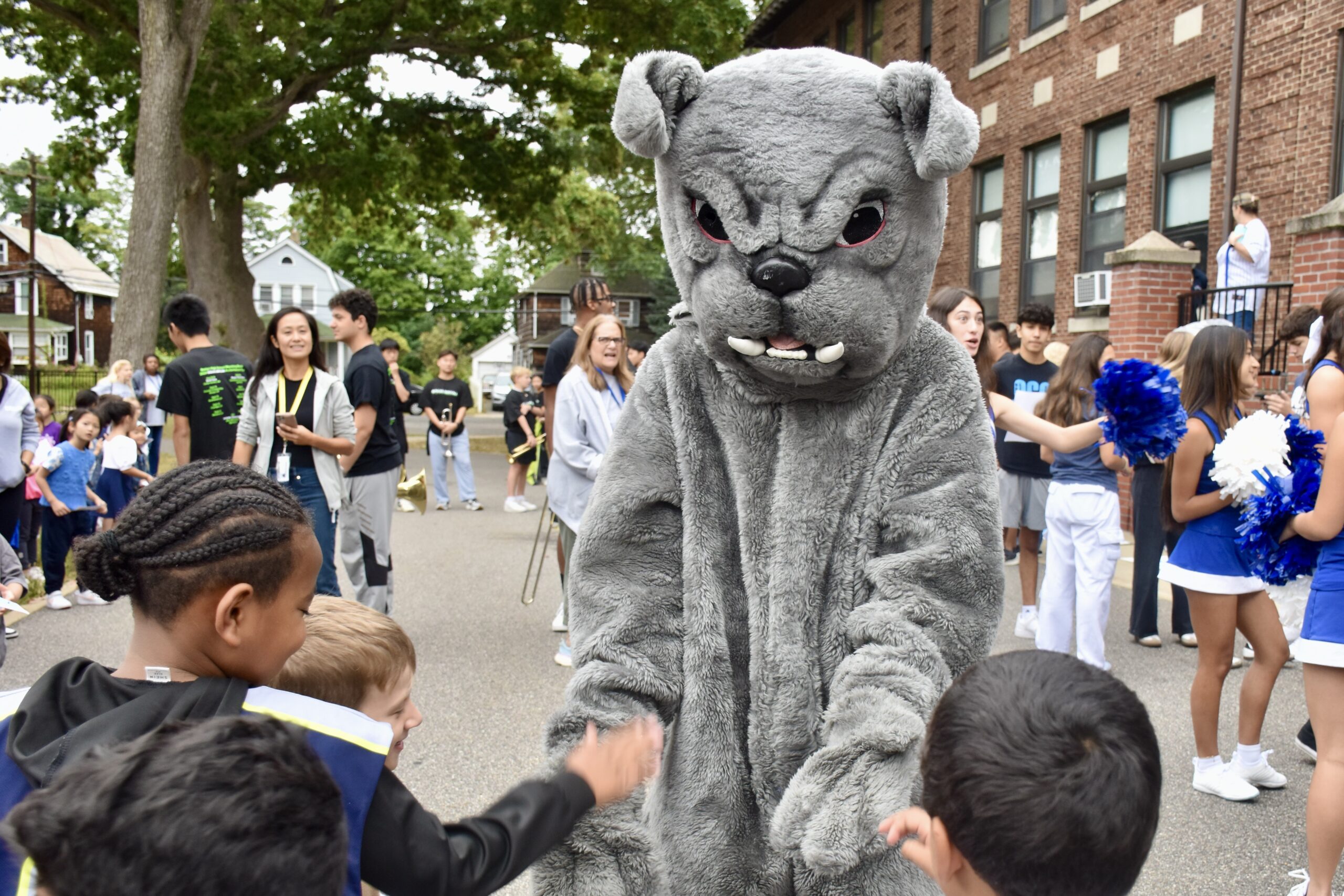 On Thursday, Sept. 26, the Organization of Class Council, members of the football and cheerleading teams, and the Roslyn Marching Band toured all three elementary schools to entertain the children with spirited pep rallies. The young students were thrilled by a visit from the school mascot.