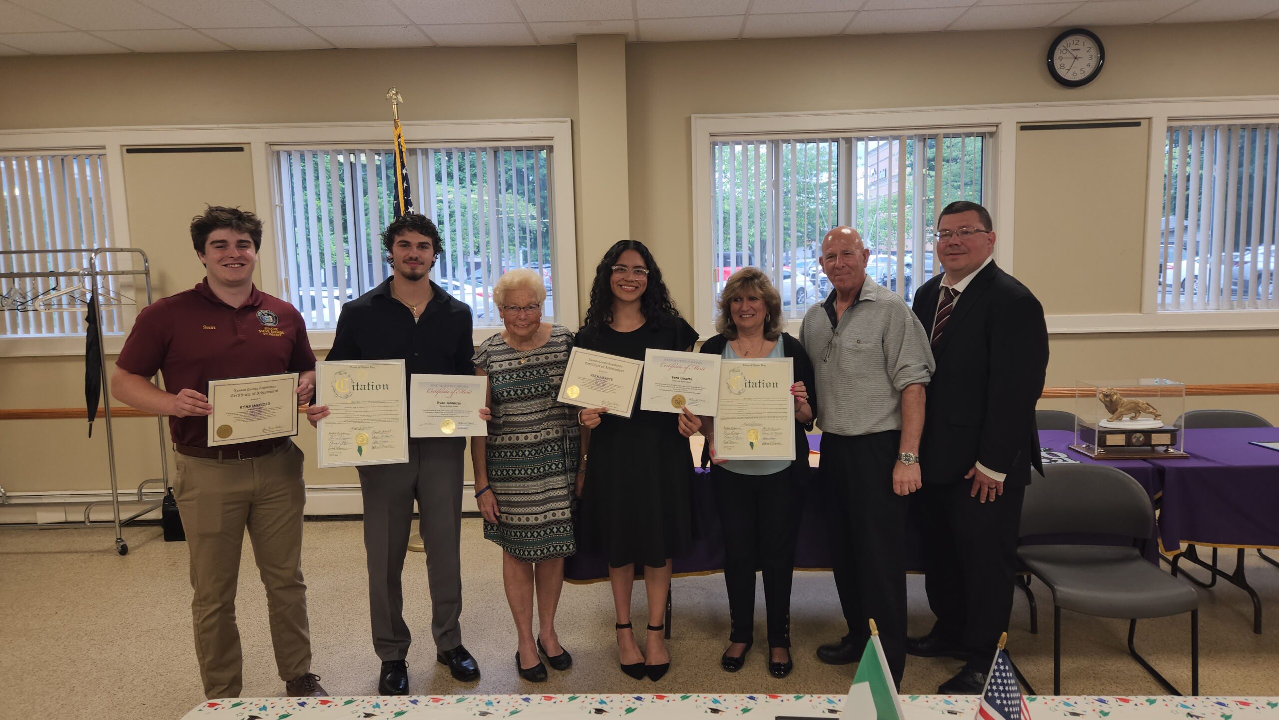 Order Sons and Daughters of Italy, Galileo Galilei Lodge were proud to present scholarships to two Hicksville High School students. Pictured from the left in attendance were Sean (on behalf of NYS Senator Steven Rhoads), Recipient Ryan Iannuzzo, Nassau County Legislator Rose Marie Walker, Recipient Vera Linarte of the Dante Alighieri Award for her hard work in Italian Studies, Committee Chairperson Laura DiGirolamo, Vice President Peter Sarandrea and Worthy President Chris Hirschberg.