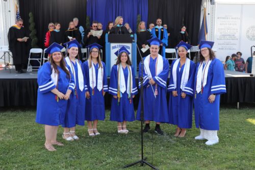 Student class president Goldie Abrahams and class club president Taylor Choi were honored to lead ceremony attendees in the Pledge of Allegiance. The class of 2024 senior vocalists then performed the National Anthem and the Schreiber Alma Matter.