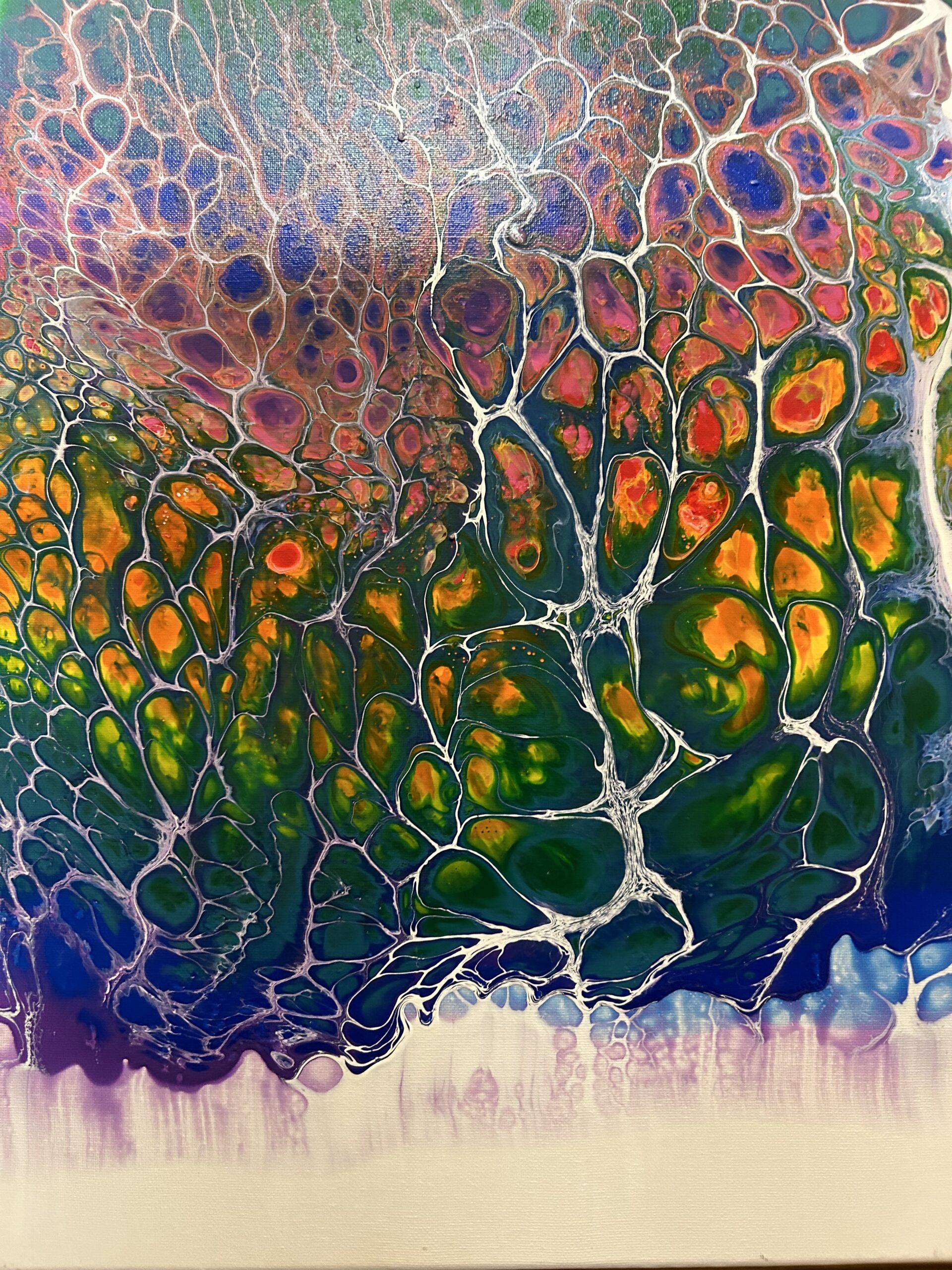The resulting paintings, whether abstract or representative, are colorful, bold and vibrant. Her abstractions frequently employ fluid art, a technique that involves the use of free-flowing or very runny acrylics, powdered pigments or inks, and she sometimes incorporates recycled household materials into her works.