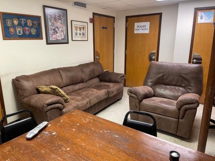 Some office spaces double as locker rooms for the officer who occupies them because the locker room on the lower level is already overcrowded. The male locker room isn’t big enough for the number of male officers, and there was no female locker room, so a storage closet was cleaned out and made into one to accommodate the female officers.