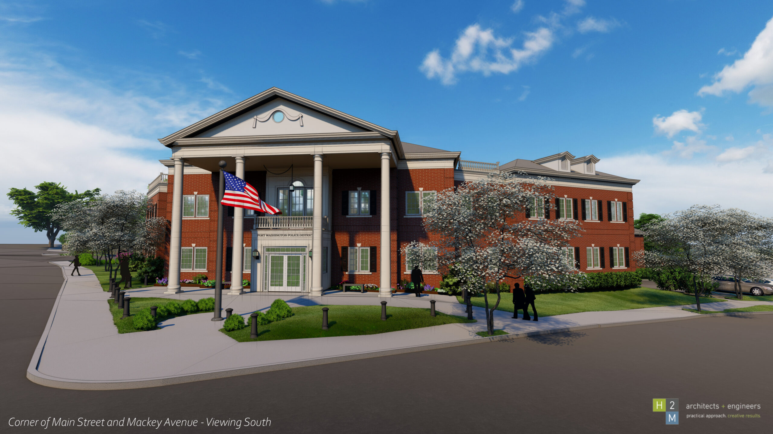 Artist illustration of the new Port Washington Police District headquarters standing viewing south from the corner of Main Street and Mackey Avenue (Rendering from H2M Architects and Engineers)